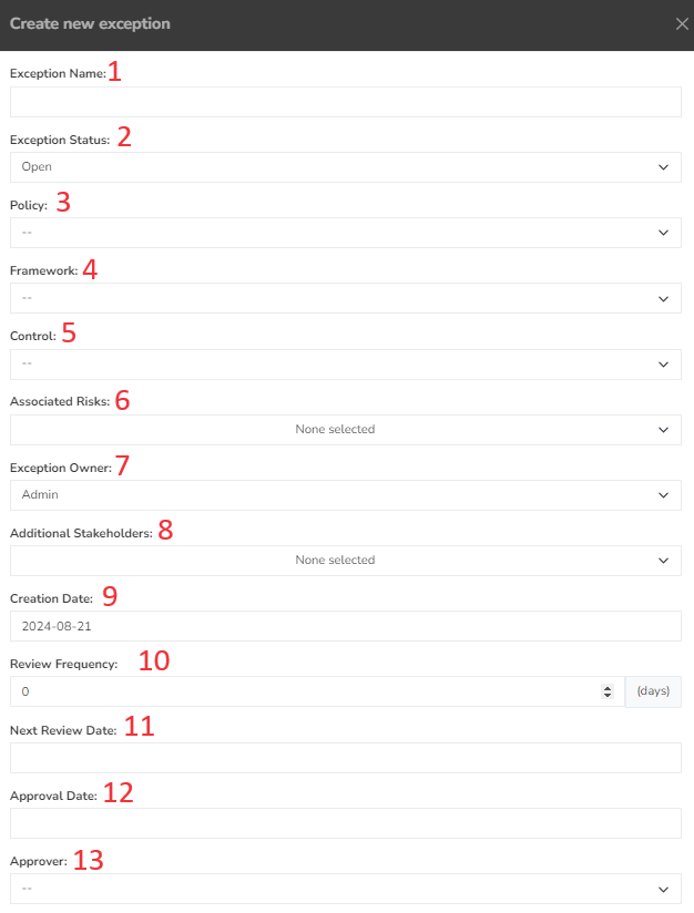 - Next Review Date - This field is for noting the next scheduled date for reviewing the exception.