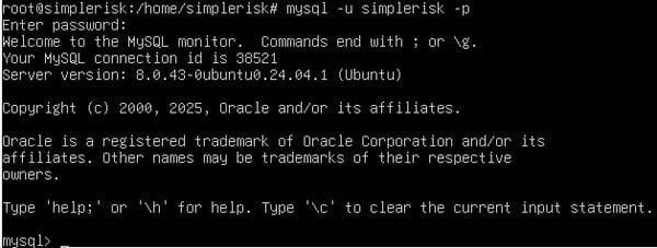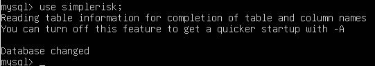 3. Once inside the MySQL console, select the SimpleRisk database: use simplerisk;