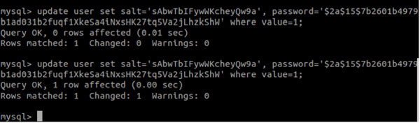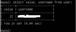 4. To confirm that the admin user is still present, run: select value, username from user;