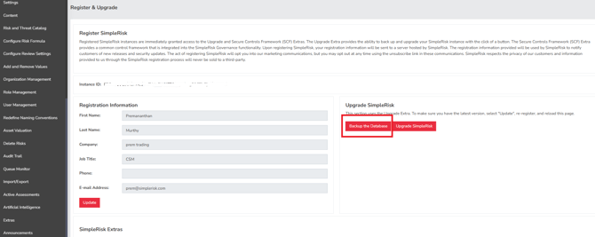 To access the “Backup the Database” button, you must have a registered instance of SimpleRisk with the “Upgrade” extra installed. Rest assured, any information provided will remain confidential and will only be used to assist you in utilizing SimpleRisk effectively.