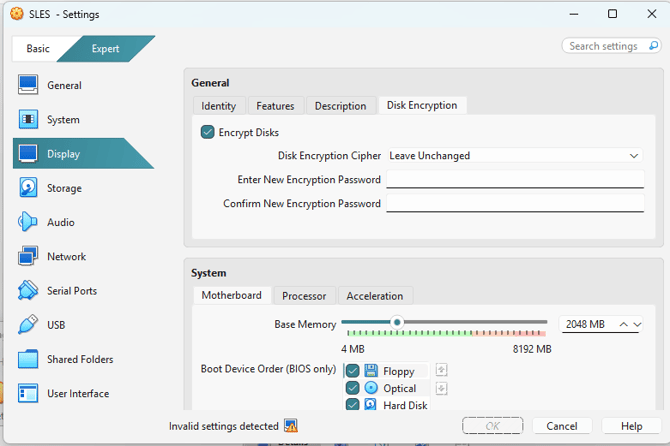 3) In the Settings window, navigate to the General section and click on the Disk Encryption tab, as illustrated in the accompanying image. Fill in the required fields as shown in the screenshot. Remember, the password you set here will be needed each time you start the VM.