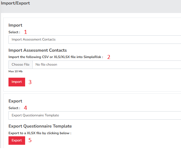 This page allows users to conveniently import existing data into various categories, including assessment contacts, questions for assessment questionnaires, templates for assessment questionnaires, and completed questionnaire assessments, using CSV or XLS/XLSX formats. Additionally, you can export these data types directly from this page.