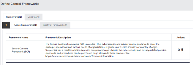 To begin, click the “+” button located to the right of “Define Control Frameworks.” This action will open a pop-up menu where you can enter the details of the new framework.