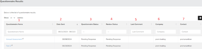 The Questionnaire Results page displays comprehensive information about the questionnaire. This includes which type of questionnaire was sent for assessment—whether it is a customer satisfaction survey, employee feedback form, or any other specialized questionnaire relevant to your needs. Additionally, the status of the questionnaire is clearly indicated, allowing you to easily understand whether it is pending, in progress, or completed. Moreover, the page features essential details such as the contact person assigned to this questionnaire, ensuring that you have a direct point of communication for any queries or follow-up actions. You will also find the name of the Company associated with the questionnaire, providing context and clarity regarding the organization involved. Lastly, it specifies whether the questionnaire has been reviewed, giving you insight into the current progress and the next steps in the assessment process. This comprehensive overview ensures you have all the necessary information at your fingertips to facilitate effective decision-making and follow-up.