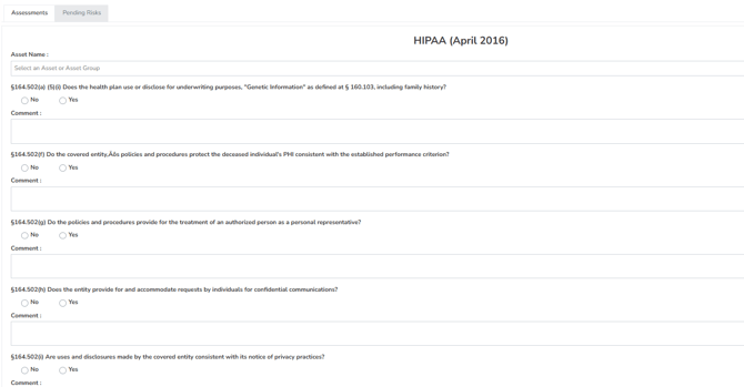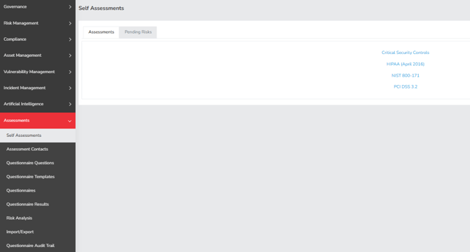 The Self Assessment page shows all the assessments that’s available by default and the pending risk that is detected once the assessment is submitted in Simplerisk. This page should have served to answer all questions related to the Available Assessment & Pending Risk page but if you feel anything has been missed or just seek further clarification, please reach out to us at support@simplerisk.com.