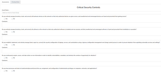 - Critical Security Controls - This brings up the critical security controls assessments where users can answer the questions, then based on the answers Simplerisk will show if there’s any pending risks.