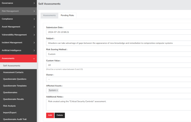 After you submit the assessment, any detected risks will automatically appear under 'Pending Risk.' You will then need to decide whether to “add” or “delete” the pending risk.
