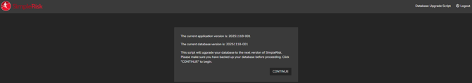 Assuming that you have the right upgrade script to upgrade this version, it should tell you to click “CONTINUE in order to proceed: Click “CONTINUE”. You should see a series of messages indicating that the database is being upgraded. Assuming that it completes successfully, you should see a final message indicating that the SimpleRisk database upgrade is complete.